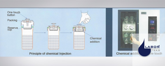 Measuring first the required quantity of chemical solution or chemical powder by scale or pipette, then load chemical into the reserve cup of dyepot and go for dyeing process, when opening the door of the ECO DYER, the drum rotation is automatically stopped, just push the button on the top of injection lid while chemical addition is required, the chemical solution is then fed into the dyepots from reserve cup slowly as similar as bulk dyeing to avoid direct contact with the substrate. Thanks to this “ONE TOUCH “ injection system, shade leveling and repro¬ducibility are assured.